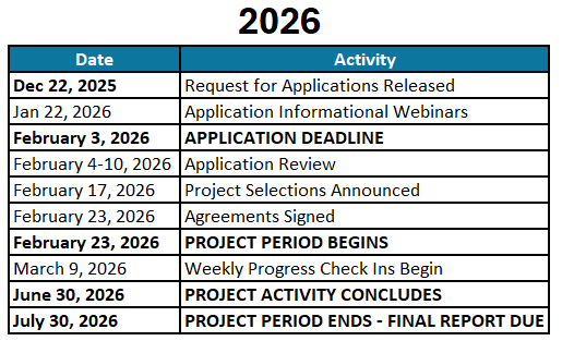All funded activities must be completed by Tuesday, June 30, 2026. A Final Report must be completed and submitted by the lead organization within 30 days of activity completion.